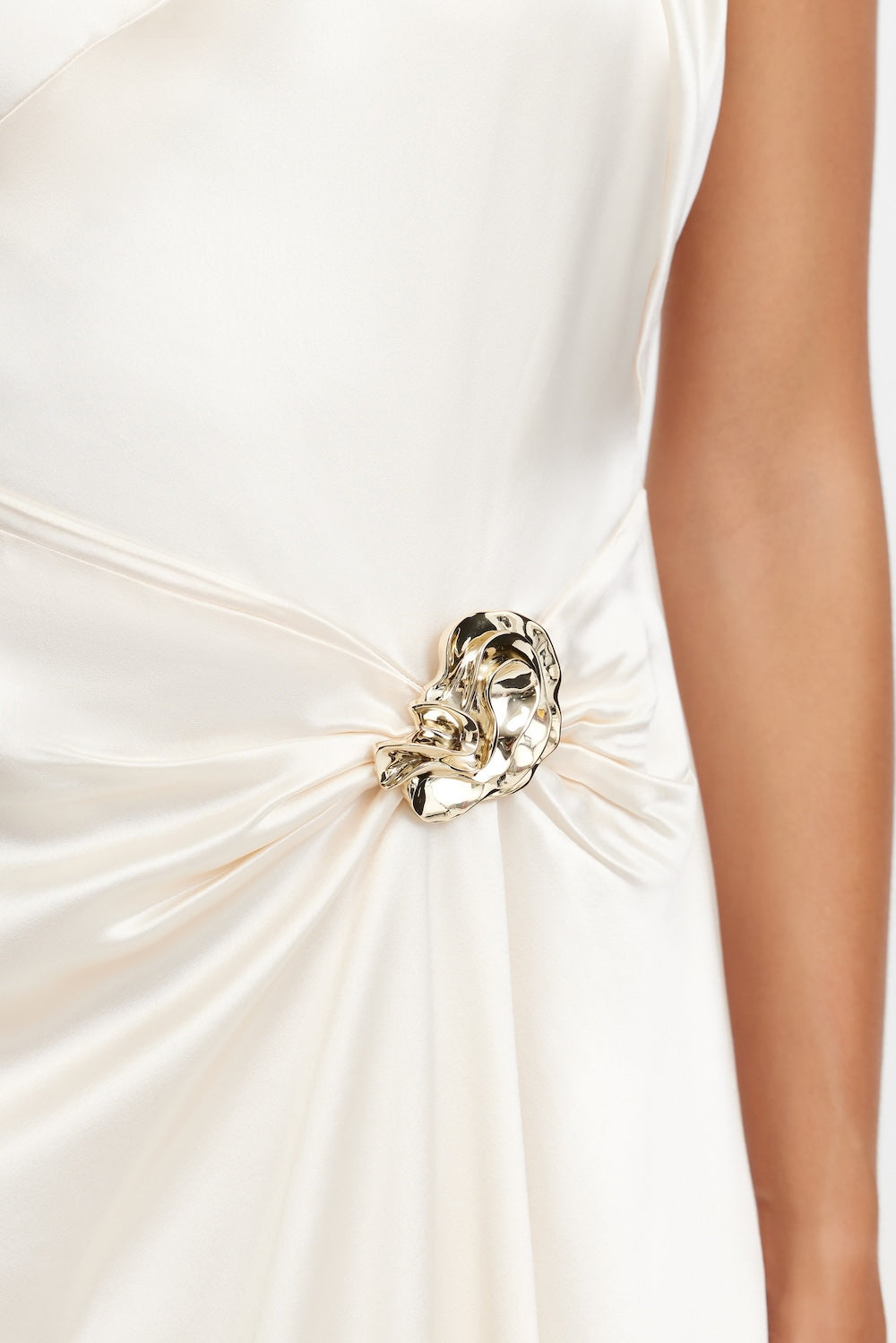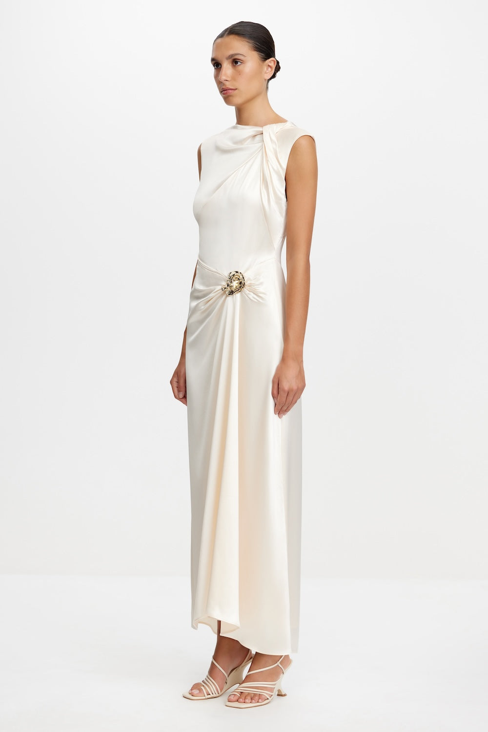 Introducing the Redman Maxi Dress in Pearl, a timeless piece with incredible attention to detail. The draped satin bodice enhances the silhouette, meeting at the waist with a gold hardware trim for subtle structure. The fluid maxi skirt balances movement and elegance, while the invisible center-back zip allows for a flawless finish. Pair with a heel for the full look or dress it down with a sandal for a long lunch. – Draped bodice- Gold hardware at the waist- Flowing satin skirt- Invisible zip closureModel is 178cm / 5’10” wearing an AU 8 / US 4Composition:Main: 76% Acetate, 24% PolyesterLining: 97% Polyester, 3% ElastaneExclusive of decoration
